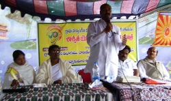 “Shashwat Yogic Kheti Abhiyan” launched at Shanti Sarovar, Hyderabad on 7.11.2010. Abhiyan moved towards Nizamabad District.in Andhra Pradesh. In Nizamabad dist. campaign started from 8.11.2010 to 30.11.2010. It has covered 36 mandals in the Nizamabad district and one division in Adilabad district. About 168 major Gram Panchayat villages are covered during this Campaign.In the photo is Ramayampet mandal where the campaign was welcomed by the MPP, AMC chairman and Surpanch. They expressed that this type of service is utmost need of the farmers since most of the farmers suicide cases are from this district. In the photo graph are MPP giving the speech, Surpanch and BK Jaya In charge of Kamareddy Centre, BK Arundati and BK Anil are on the stage.